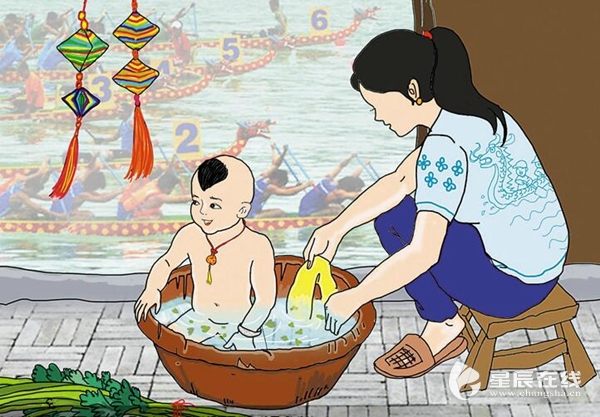 至今,老長(zhǎng)沙的家庭仍保留有在端午用艾葉水為小孩洗澡的風(fēng)俗。繪圖/陳谷苗