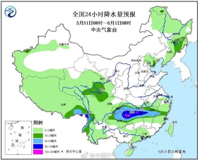 31日白天省內(nèi)大部分地區(qū)有小到中等陣雨或雷陣雨,31日晚降水加強(qiáng),湘北部分地區(qū)大到暴雨,局地大暴雨;6月1日雨帶南移湘中偏北一線、湘東部分地區(qū)大到暴雨,局地大暴雨;2日雨帶移出我省天氣短暫好轉(zhuǎn);預(yù)計5月31日~6月1日過程累計雨量:湘中以北、湘東50~100毫米,其中湘東北部分100~150毫米,局地150~200毫米,其他地區(qū)25~50毫米(見附圖),最大小時雨量60~80毫米。