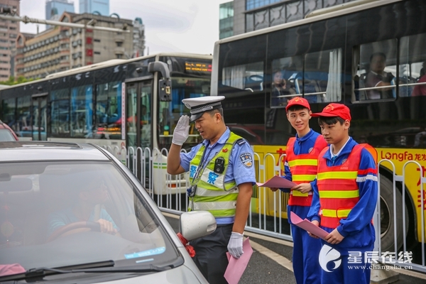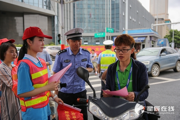 星辰在線6月14日訊(星辰全媒體記者 文帥偉)駕駛員行經(jīng)斑馬線不禮讓行人,行人過(guò)馬路闖紅燈,雖然這些交通違法行為并不嚴(yán)重,但帶來(lái)的危害和隱患卻非常大。6月14日上午,開(kāi)福交警大隊(duì)和長(zhǎng)沙財(cái)經(jīng)學(xué)校的學(xué)生一起,對(duì)路面的不文明行為進(jìn)行勸導(dǎo)。