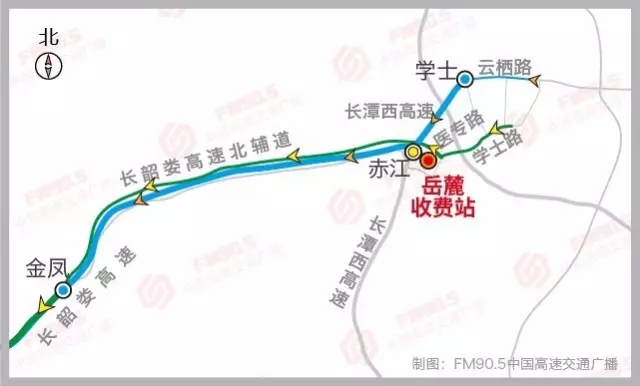 線路2:學(xué)士路及周邊道路設(shè)置預(yù)告,引導(dǎo)一部分車輛由長潭西學(xué)士收費(fèi)站上高速,經(jīng)赤江互通,轉(zhuǎn)長韶婁高速,往婁底方向。