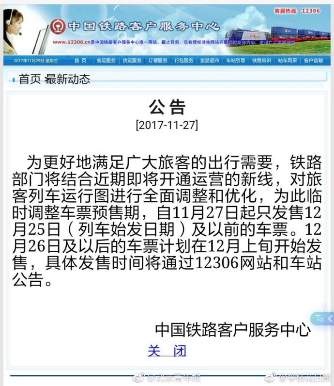 年底將至,鐵路部門將結(jié)合近期即將開通運(yùn)營的新線,對旅客列車運(yùn)行圖進(jìn)行全面調(diào)整和優(yōu)化。近日,中國鐵路客戶服務(wù)中心發(fā)布公告,臨時(shí)調(diào)整車票預(yù)售期,自11月27日起只發(fā)售12月25日(列車始發(fā)日期)及以前的車票。12月26日及以后的車票計(jì)劃在12月上旬開始發(fā)售,具體發(fā)售時(shí)間將通過12306網(wǎng)站和車站公告。